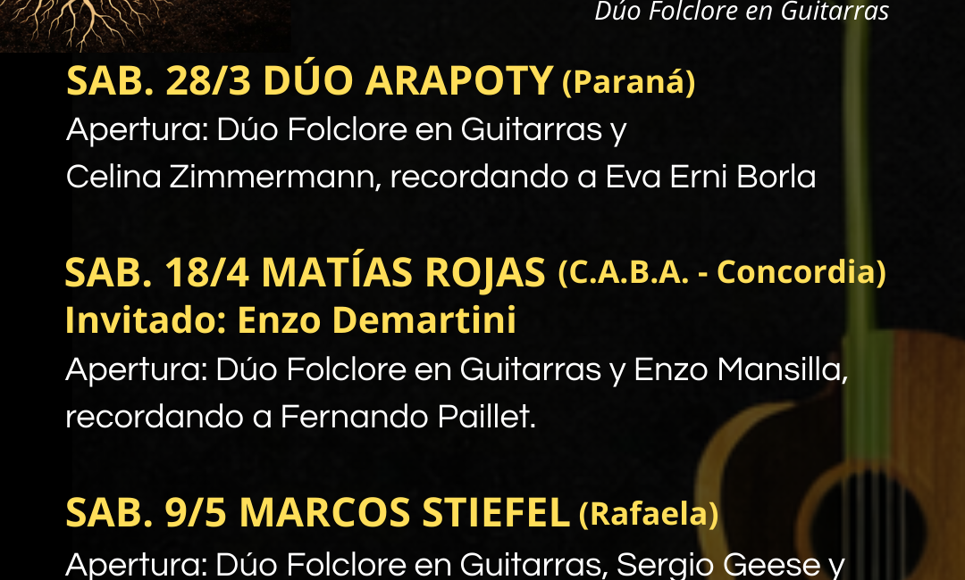 - Invitados: Matías Rojas (guitarra) y Enzo Demartini (acordeón). Presentación del disco «El mismo río», una búsqueda íntima por los sonidos litoraleños.