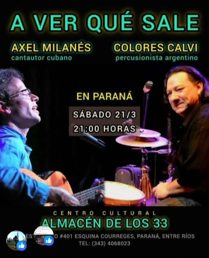 El cantautor cubano Axel Milanés vuelve a compartir su música profunda, poética y necesaria, acompañado por la potencia rítmica de la máquina de percusión Alejandro «Colores» Calvi.