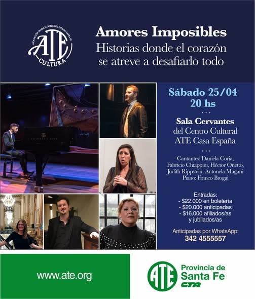 El sábado 25 de abril a las 20Hs en la Sala Cervantes se presenta Amores Imposibles. Descuento para afiliados/as. Historias donde el corazón se atreve a desafiarlo todo. Cantantes: Daniela Coria, Fabricio Chiappini, Héctor Onetto, Judith Rippstein, Antonela Magani. Piano: Franco Broggi.