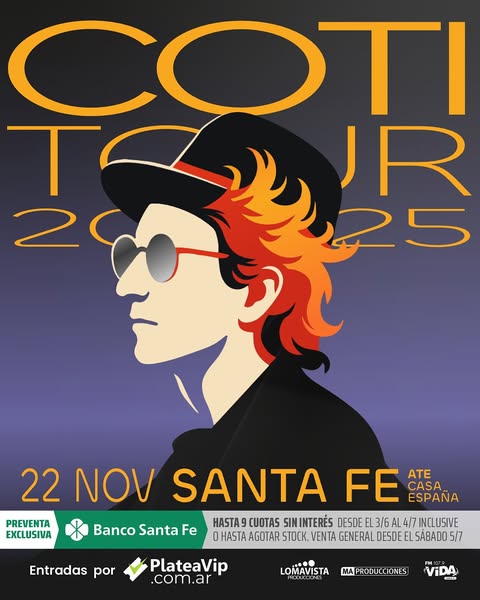 Una noche para cantar todos los hits, emocionarse y vivir el tour 2025 como se merece!! Sábado 22 de noviembre en ATE Casa España – Santa Fe. Preventa exclusiva para clientes de Banco Santa Fe – Hasta 9 cuotas sin interés con tarjetas de crédito, hasta el 4/7 o hasta agotar stock. Venta general a partir del 5/7. Entradas por plateavip.com.ar