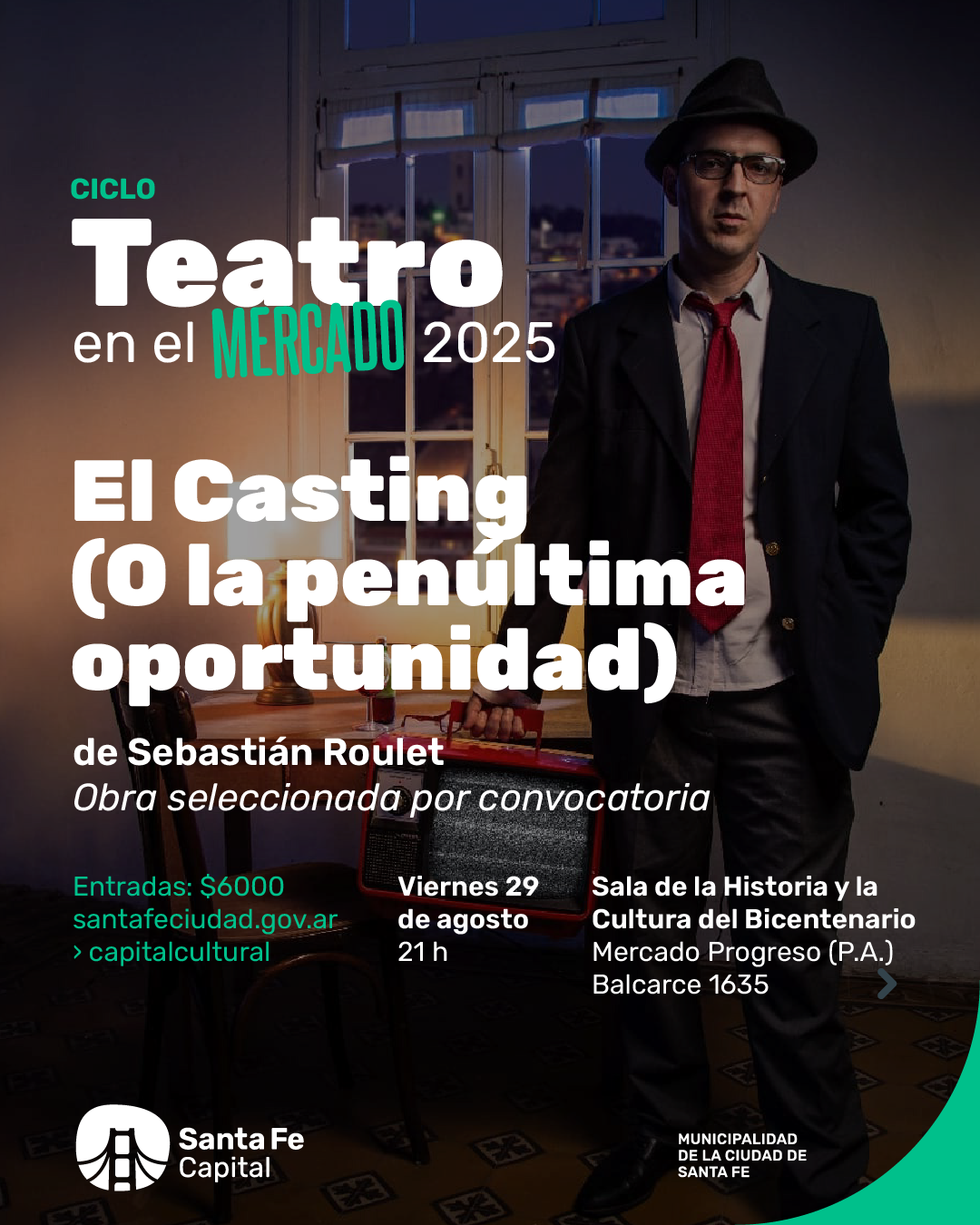 Unipersonal escrito e interpretado por Sebastián Roulet. Dirección actoral de Mariana Mosset. Un hombre llega del trabajo con el objetivo de realizar un casting virtual desde su casa. Repasa la escena de la película que le indicaron que estudie previamente para poder presentarse.