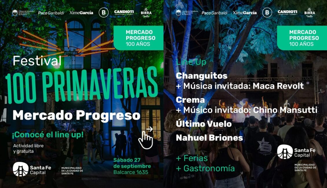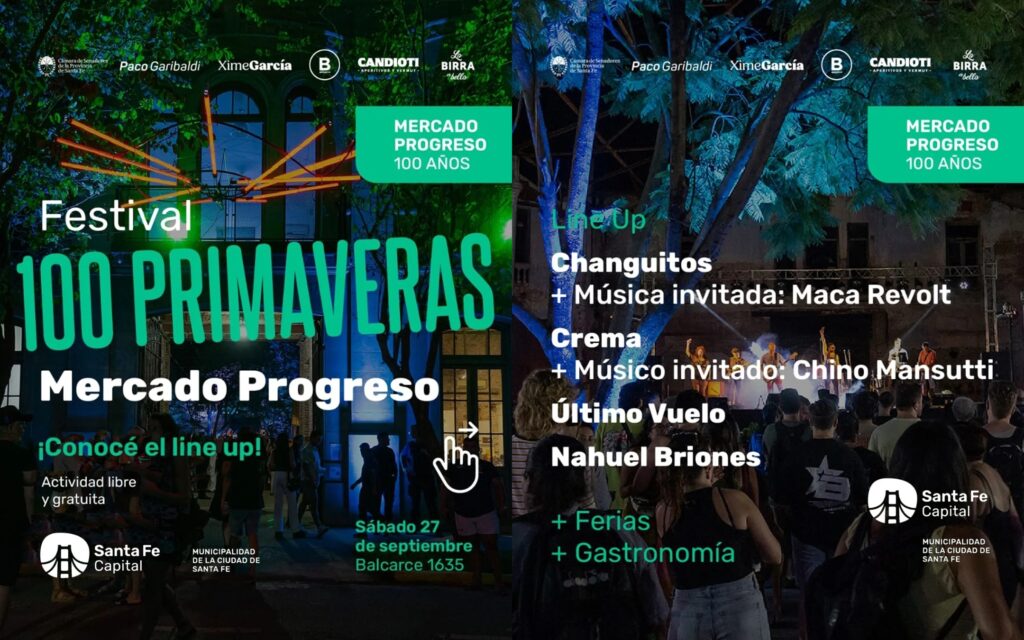 ¡Esta es la programación completa del Festival 100 Primaveras! Vení a vivir una jornada única con shows musicales, ferias, actividades para las infancias y la mejor gastronomía. Te invitamos a seguir festejando los 100 años del Mercado Progreso, ¡no te lo pierdas! Sábado 27 de septiembre. 18 horas. Mercado Progreso, Balcarce 1635. Actividad libre y gratuita.