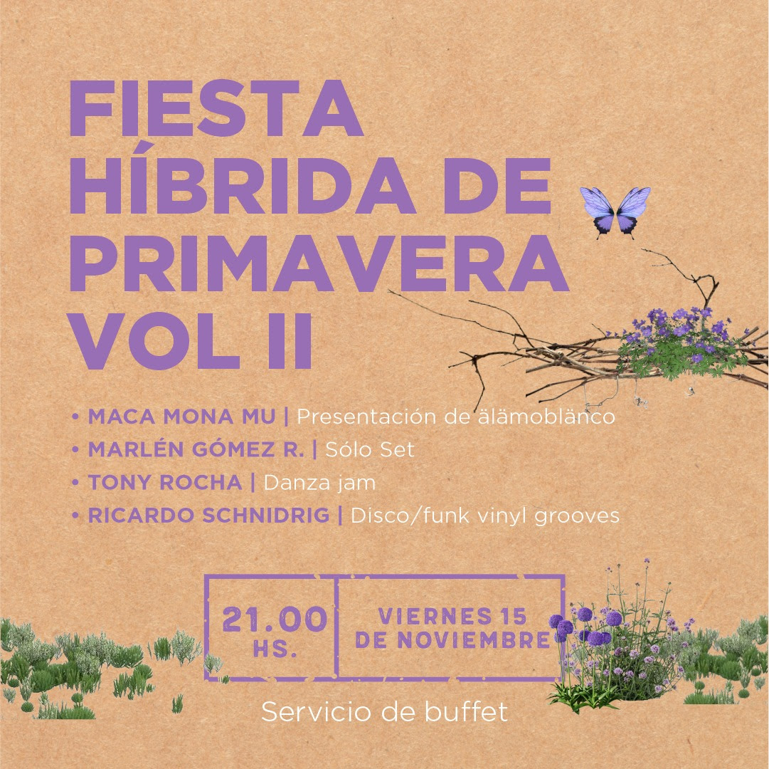 El viernes 15 de noviembre a las 21 horas, La Casa de Adelante (Saavedra 2248) se aventura al volumen II de Fiesta Híbrida de Primavera. En esta ocasión, la cantante, compositora y multi instrumentista Maca Mona Mu, presentará su nuevo disco «älämoblänco». También serán parte del evento que combina diferentes expresiones y lenguajes artísticos, Marlén Gómez Rodriguez en formato solo set, Tony Rocha con su intervención de danza jam y el DJ Ricardo Schindrig con su set de disco/funk vinyl grooves.