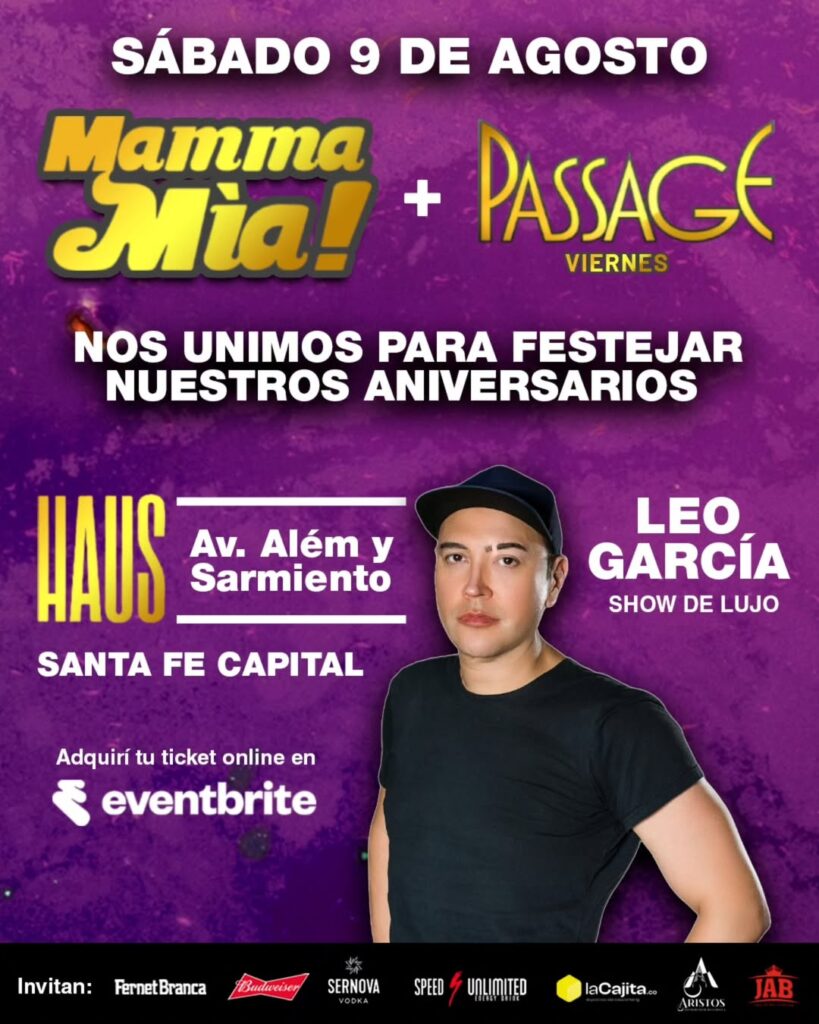 El sábado 9 de agosto prepárate para una noche inolvidable en Haus Club (Av. Alem y Sarmiento – Santa Fe Capital). Mamma Mia! y Passage se unen para celebrar sus aniversarios, 14 y 35 años respectivamente.