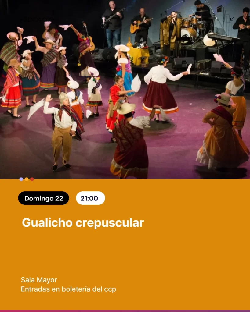«Gualicho crepuscular». tendrá su gran noche en el CCP el domingo 22 de junio a las 21Hs. Las entradas están a la venta. Espectáculo Folklórico «Gualicho Crespuscular» de Karen Folklore y compañía de Danzas «Ecos de la Tierra» (Prof. Silvia Giménez) es un viaje musical por nuestro país.