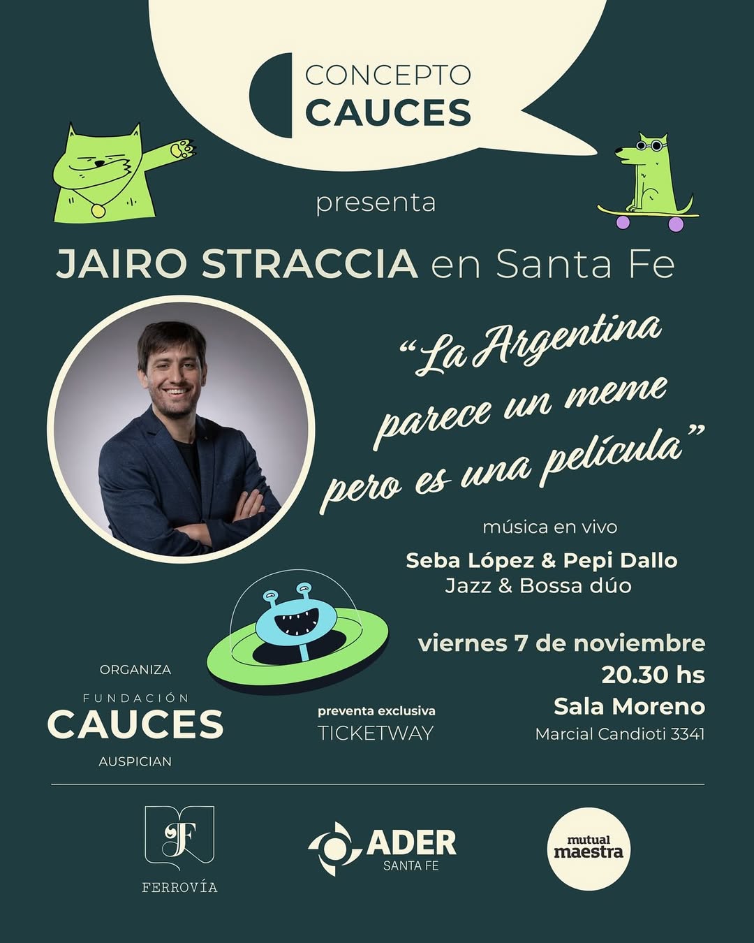 El próximo viernes 7 de noviembre a las 20:30Hs en la sala auditorio de La Moreno (Marcial Candioti 3341 – Santa Fe), el destacado y multipremiado periodista Jairo Straccia será parte de “Concepto Cauces”, un nuevo conversatorio interactivo con música en vivo. La actividad, denominada, “Argentina parece un meme, pero es una película”, en la cual Straccia analizará la actual coyuntura económica y política nacional, permitirá al público santafesino interactuar con el invitado, disfrutar de una velada de jazz con la actuación de Seba López & Pepi Dallo Dúo, stands de talleres y proyectos, buffet de comida y tragos. El evento organizado por la Fundación Cauces, cuenta con la colaboración de Librería Ferrovía, ADER y Mutual Maestra.