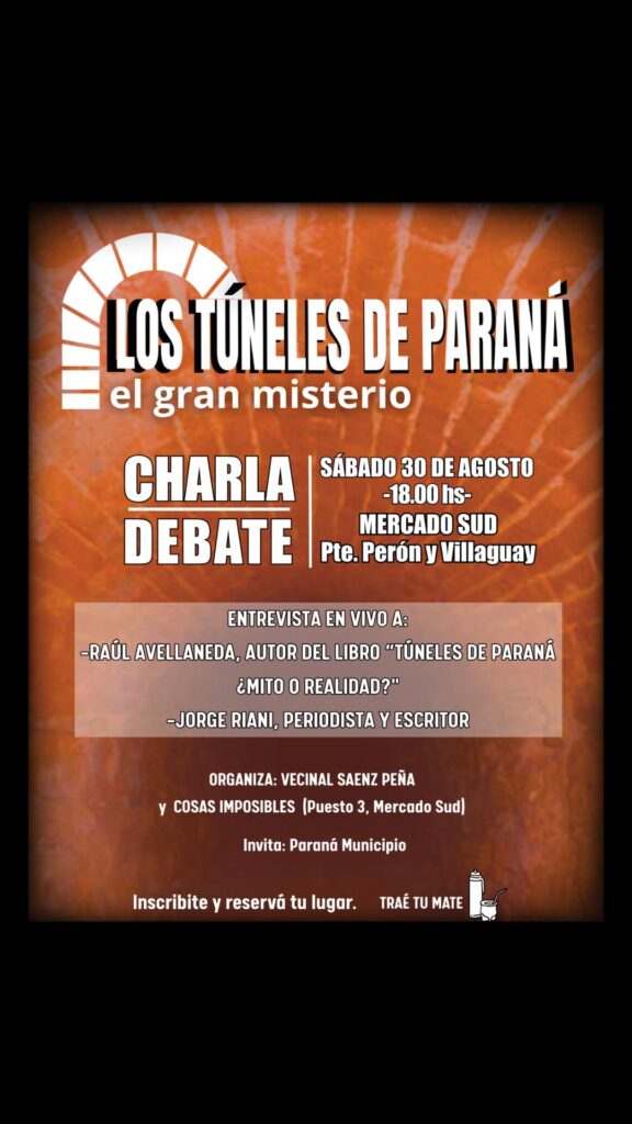 Este sábado 30/08 a las 18 hs en el Mercado Sud, la Vecinal Saenz Peña y Cosas Imposibles (puesto 3 del Mercado Sud) organizan la charla/debate «LOS TÚNELES DE PARANÁ – EL GRAN MISTERIO» . Se hará una entrevista en vivo a Raúl Avellaneda, autor del libro: Túneles de Paraná ¿Mito o realidad? Y a Jorge Riani, periodista y escritor. La actividad es libre y gratuita. Pedimos que se inscriban en un formulario online por una cuestión de organización de los lugares. ( https://forms.gle/3eXg8VgT5k7UbWAg6 ). ¡Los esperamos!