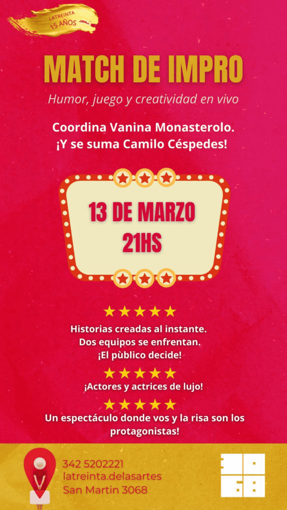 ¿Te gusta reírte? Venite al Match de Impro. Es pura adrenalina: los actores crean escenas en vivo con tus ideas. ¡Nunca hay dos funciones iguales!
