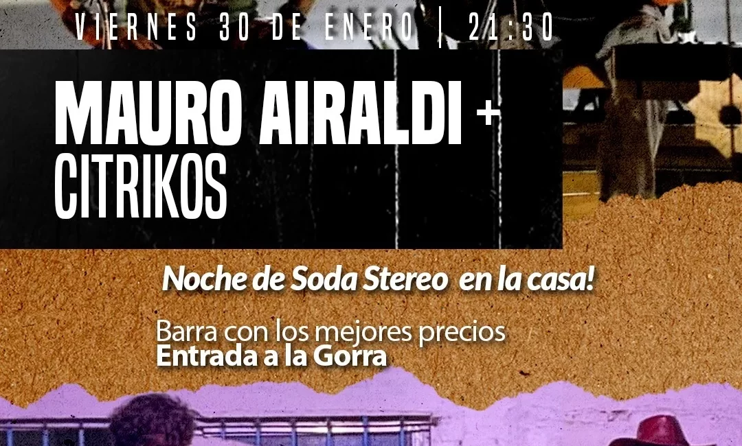 Nos encontramos para vivir una noche única con Mauro Airaldi + Citrikos (Banda invitada de la ciudad de La Paz ). Vamos a repasar lo mejor de Soda en una velada que promete mucha mística y buena compañía. Viernes 30 de enero Hora: 21:30 hs Entrada: A la gorra (¡valoramos tu apoyo al arte local!)