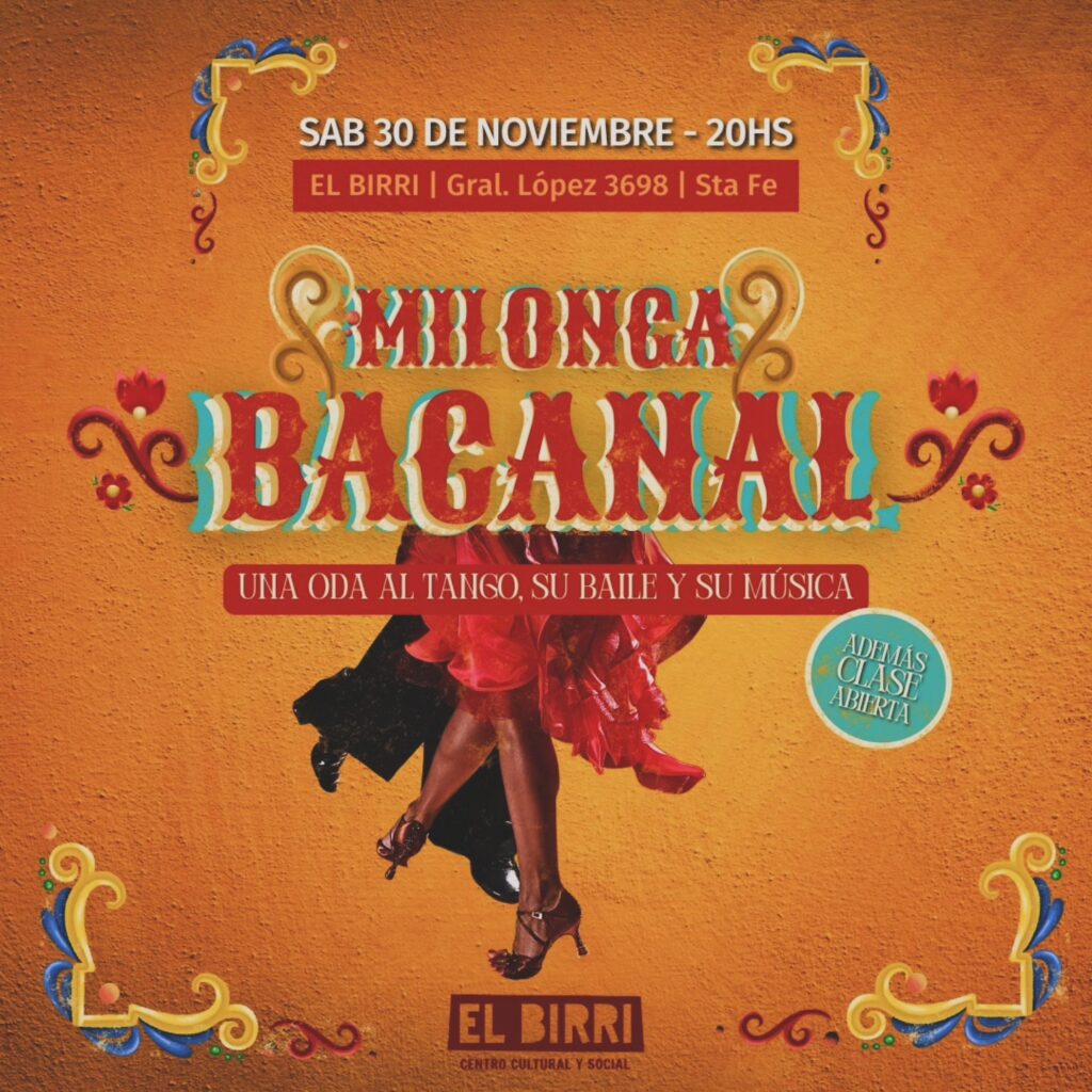 Milonga Bacanal Sábado 30 de Noviembre – 20Hs en Gral.López 3698. El Birri abre nuevamente sus puertas para disfrutar de las noches tangueras con la llegada de la «Milonga Bacanal» una oda a la fiesta como lugar del cuerpo y un homenaje a la música, la celebración al baile y a la mística del lugar.