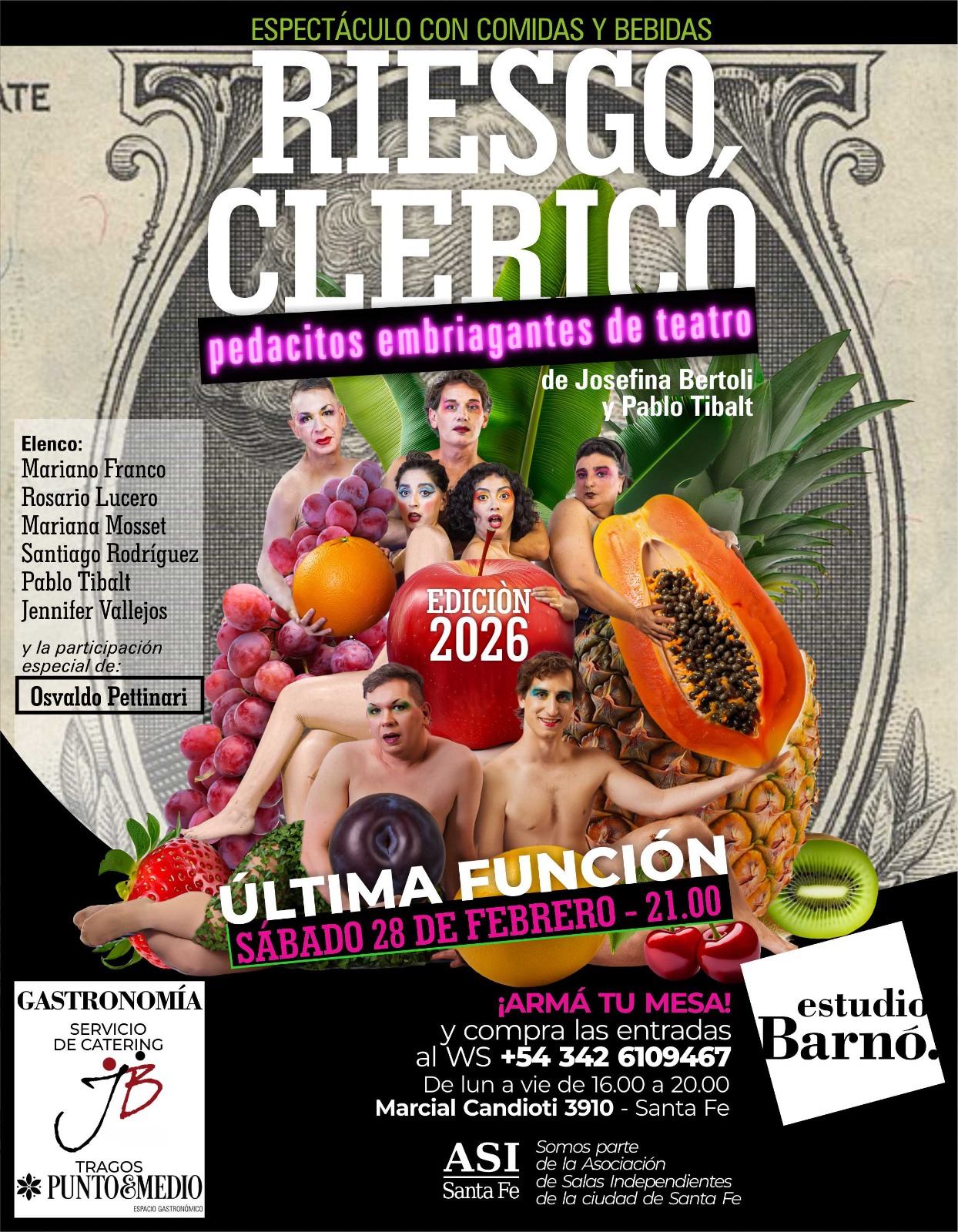 “Riesgo Clericó” llega a Estudio Barnó. La propuesta promete ser una experiencia diferente. Este verano, el teatro se transforma en un espacio cercano, fresco y lleno de sorpresas con “Riesgo Clericó”, un espectáculo de humor en formato caféconcert que se presenta los viernes y sábados en Estudio Barnó (Marcial Candioti 3910).