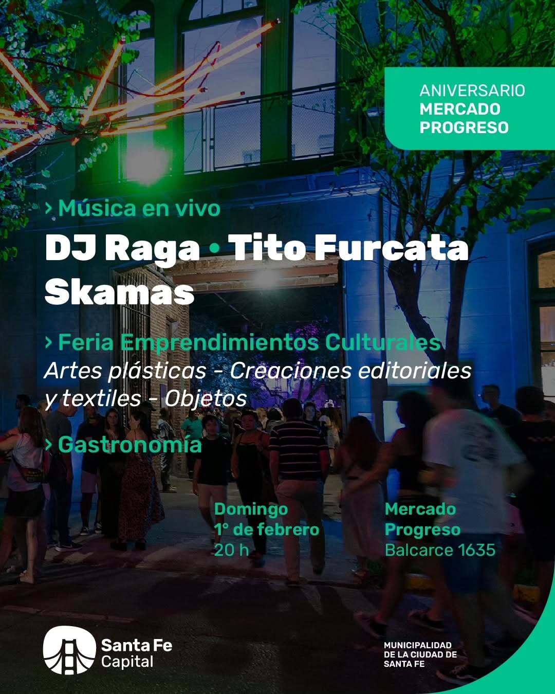 El Mercado festeja sus 101 años con una noche de música, feria y gastronomía. DJ Raga, Tito Furcata y Skamas, presentarán lo mejor de la música latinoamericana, cumbia psicodélica y ska-fusión. Además, habrá Feria de Emprendimientos Culturales y propuestas gastronómicas de los locales de barrio Candioti. Domingo 1 de febrero 20Hs, Mercado Progreso, Balcarce 1635. Entrada libre y gratuita..