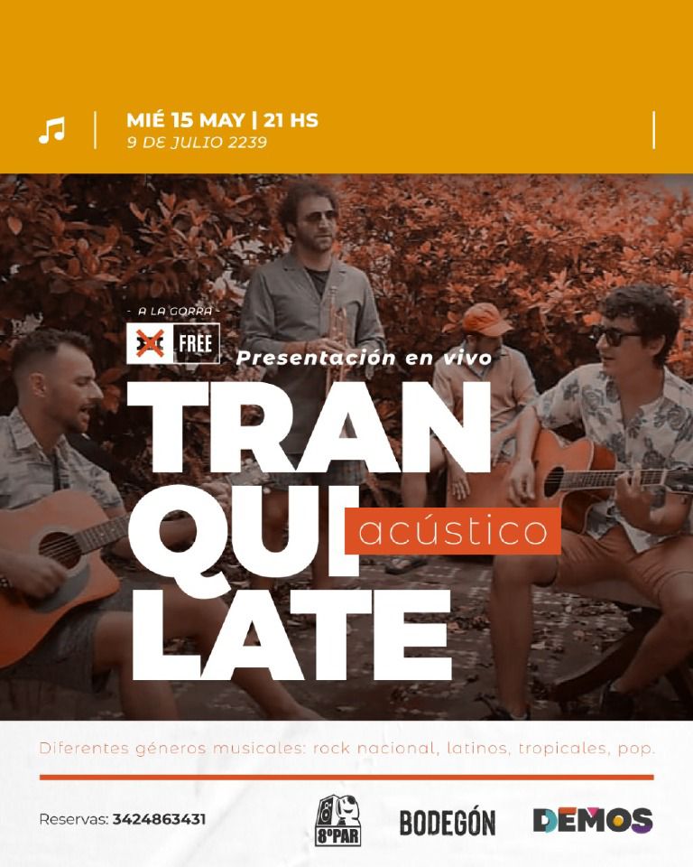 Nos vemos el próximo miércoles en DEMOS con la presentación en vivo de “Tranquilate”, banda santafesina que a través de su estilo recorren diversas canciones del rock nacional, el pop, el género tropical y latino.