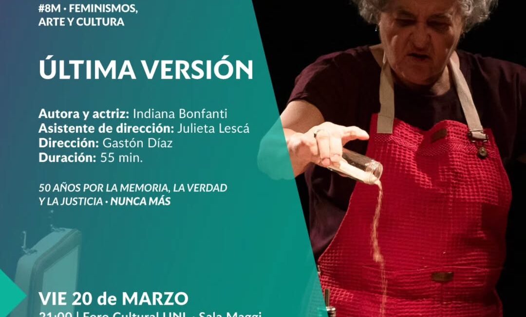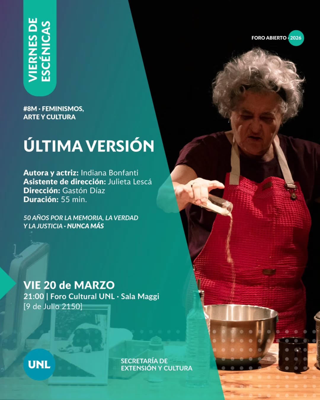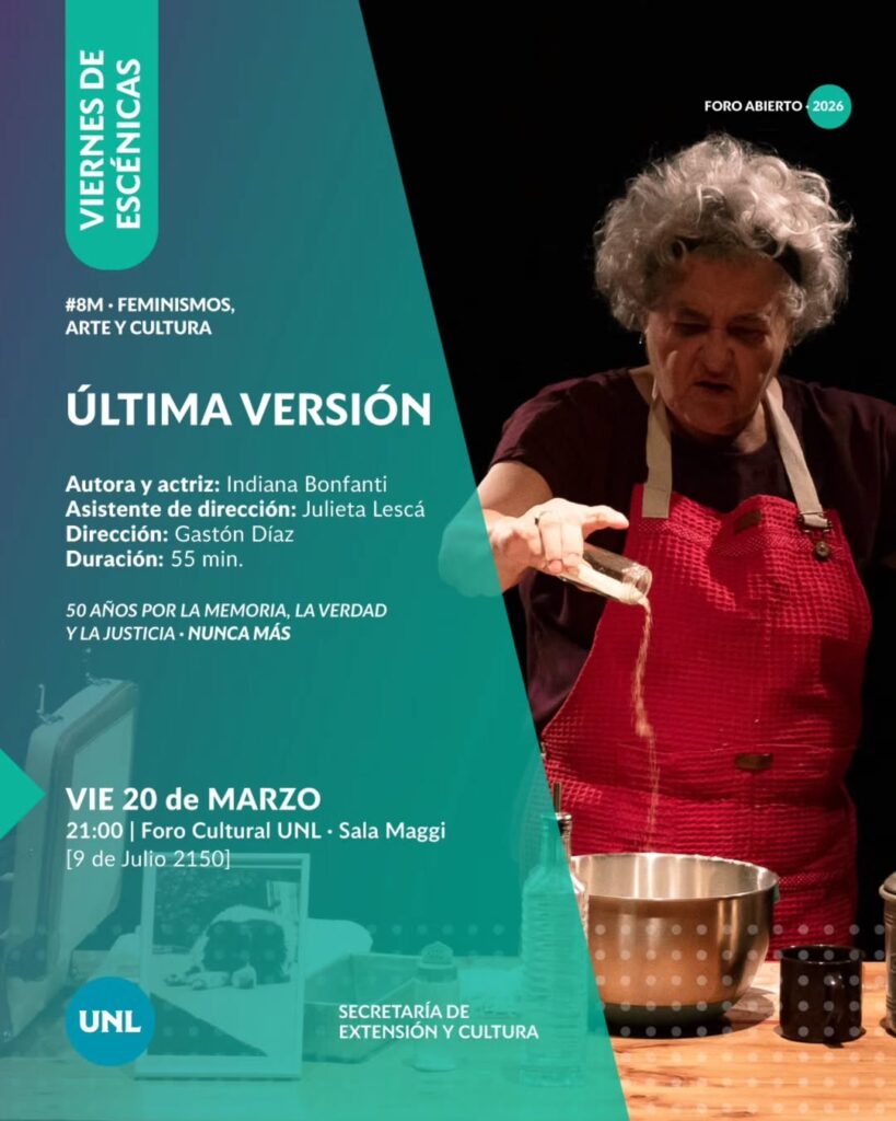 Mes de las mujeres: «Última versión» en el Ciclo Viernes de Escénicas. Se presentará la obra “Última versión” en el Ciclo Viernes de Escénicas, en el marco de «Mujeres en escena» que se llevará adelante durante marzo por el Día Internacional de las Mujeres. Será el viernes 20 de marzo en el Foro Cultural UNL a las 21Hs.